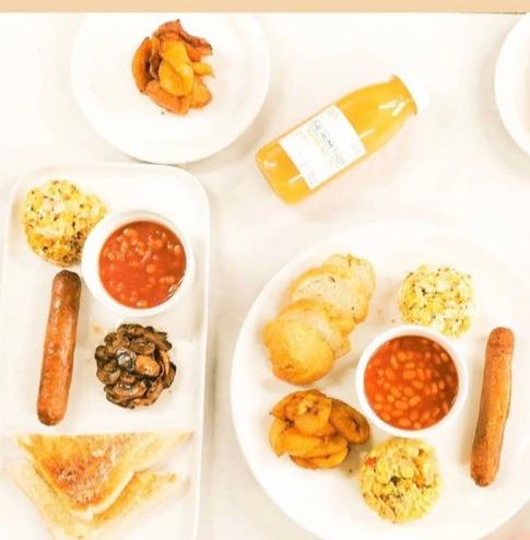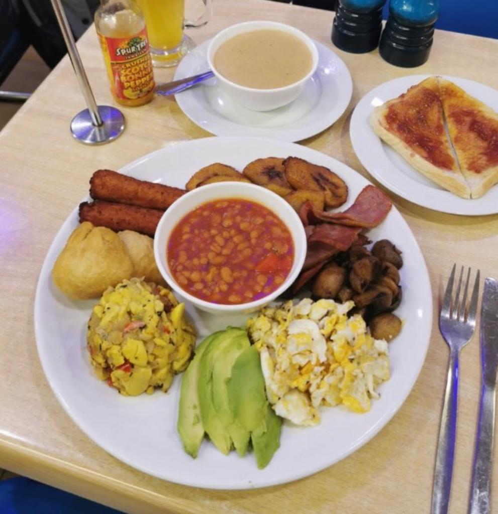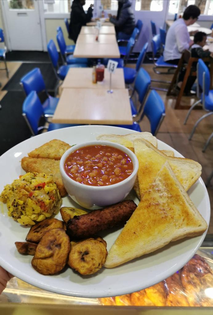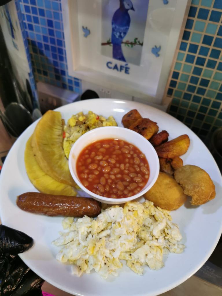 Halal Chicken or Beef Sausage Scrambled/fried eggs, Ackee & saltfish, fried dumpling, plantain and beans