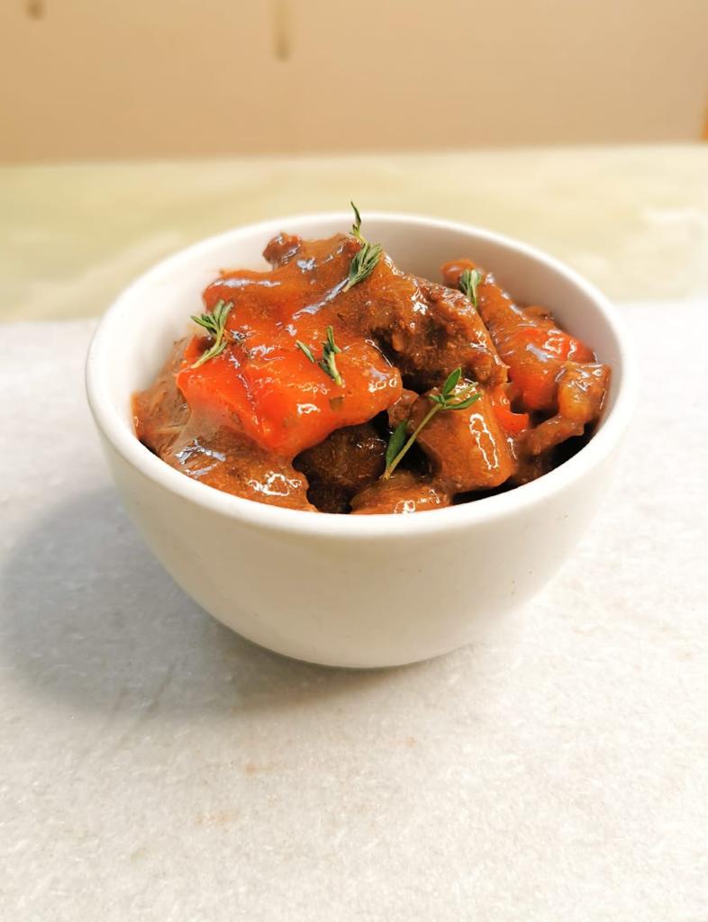 Slow cooked beef with scotch bonnet, sweet peppers and carrots and herbs